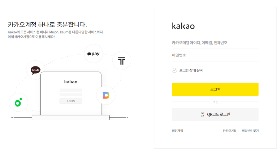 로그인 화면에서부터 쉽지않다. 업비트 회원가입이 카카오계정으로만 가능하기에 카카오계정이 무조건 있어야한다. 카카오톡 어플을 구글플레이 스토어에 들어가 휴대폰에 깔고 회원가입 진행후 진행해야한다. 카카오톡을 설치하고 회원가입이 완료 된 상태라면 아래 내용으로 넘어가도 좋다.