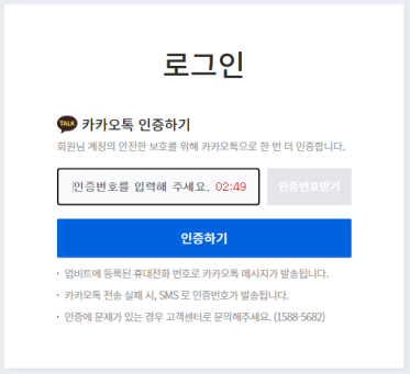 위와 같이 카카오톡 회원가입을 다 마쳤으면 카카오톡에 아이디와 비밀번호를 입력하여 로그인을 시도해준다. 로그인 시도시 휴대폰으로 로그인할건지 물어보고 확인 버튼을 누른 후 또 업비트에서 인증번호가 카카오톡에 오면 다시한번 인증번호를 입력해주면 된다. 매번 로그인 할때마다 이러한 단계를 거쳐야 한다. 휴대폰은 매번 지참해야 할 것이다.