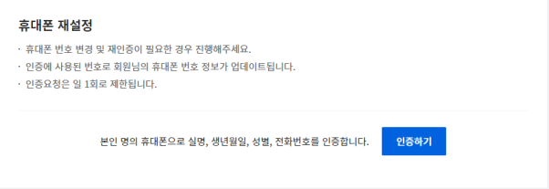 보안레벨 2단계부터는 신중하게 진행하여야 한다. 인증요청은 일 1회로 제한되기 때문이다. 파란색 인증하기 버튼을 눌러 우리가 자주사용했던 각 통신사별로 인증단계를 거치면 된다.