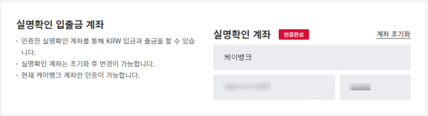 입출금 계좌 인증은 오로지 케이뱅크로만 이루어지는데 케이뱅크 모바일 어플을 구글플레이어 스토어에서 깔고 기존에 쓰던 계좌와 연결하여 실명인증까지 마친 후 해당 페이지에서(업비트 계좌 인증페이지) 자신이 개설한 케이뱅크계좌를 인증해야만 인증완료라는 버튼이 생긴다.