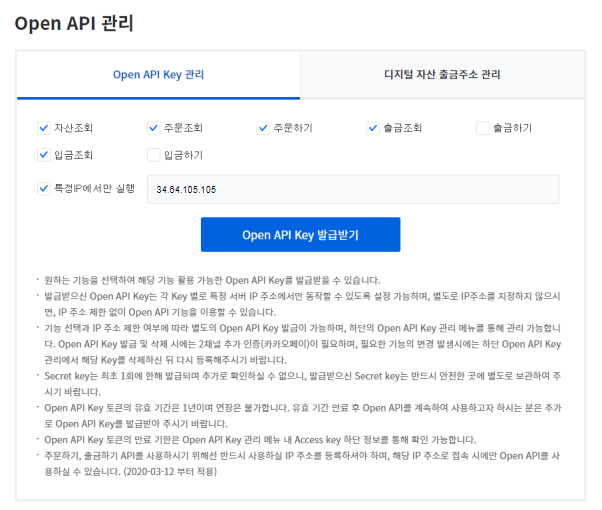 업비트 Open API key 발급방법 (자산조회, 주문조회, 주문하기, 출금조회, 입금조회 선택 및 특정 IP 입력: 34.64.105.105)