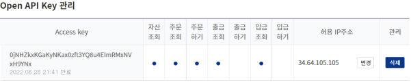 Open API key를 발급 받았다면 아래와 같이 숫자와 영어가 섞인 Access key가 나오고 해당 키로 AI 자동매매를 할 수 있다. 본인이 선택한 기능은 아래와 같이 파란색 점들로 표시되고, 허용 IP주소: 34.64.105.105를 확인할 수 있다.